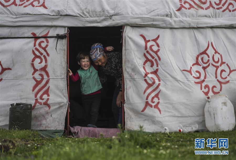 在新疆裕民县巴尔鲁克山的一处夏季牧场,4岁的阿合拉·木拉提别克(左)和奶奶阿尔马古力·木合买提拜在毡房内玩耍。阿尔马古力说,小孙女平日住在定居村庄,有时候随父母前来夏牧场探望老人(6月22日摄)。新华社记者胡虎虎摄