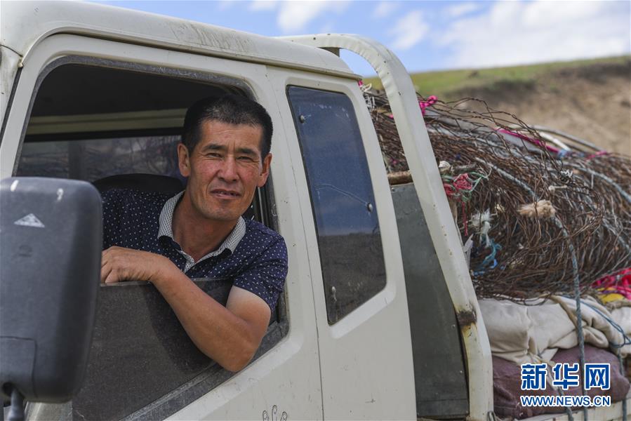 新疆裕民县吉也克镇的牧民海拉提·努尔别克驾车行驶在巴尔鲁克山中的牧道上。从6月中旬起,他开始跑转场运输的生意,从吉也克镇到巴尔鲁克山中的牧场,运输费约为500元(6月22日摄)。新华社记者胡虎虎摄
