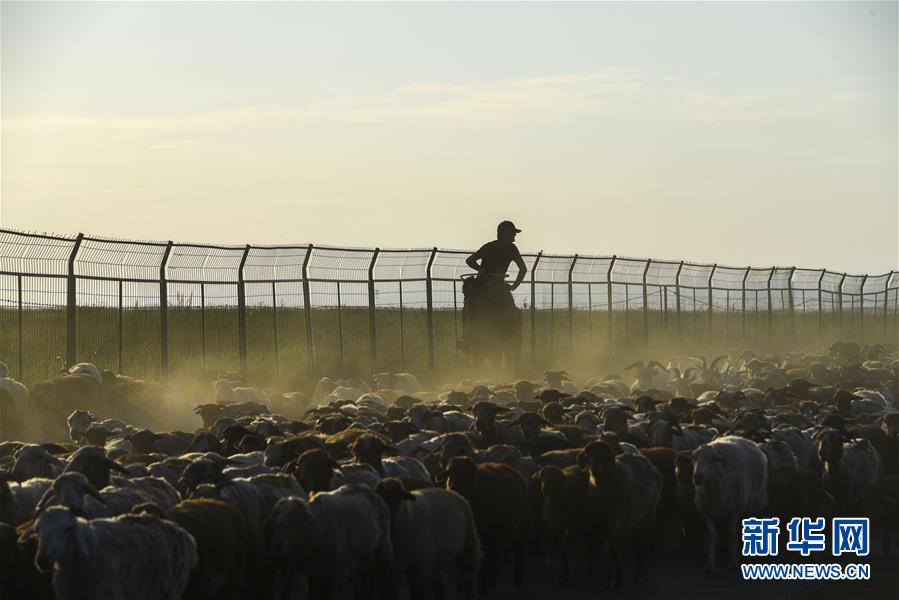 在新疆裕民县巴尔鲁克山中,迁徙中的牧民赶着羊群通过一片禁牧封育区,前往夏牧场(6月22日摄)。新华社记者胡虎虎摄