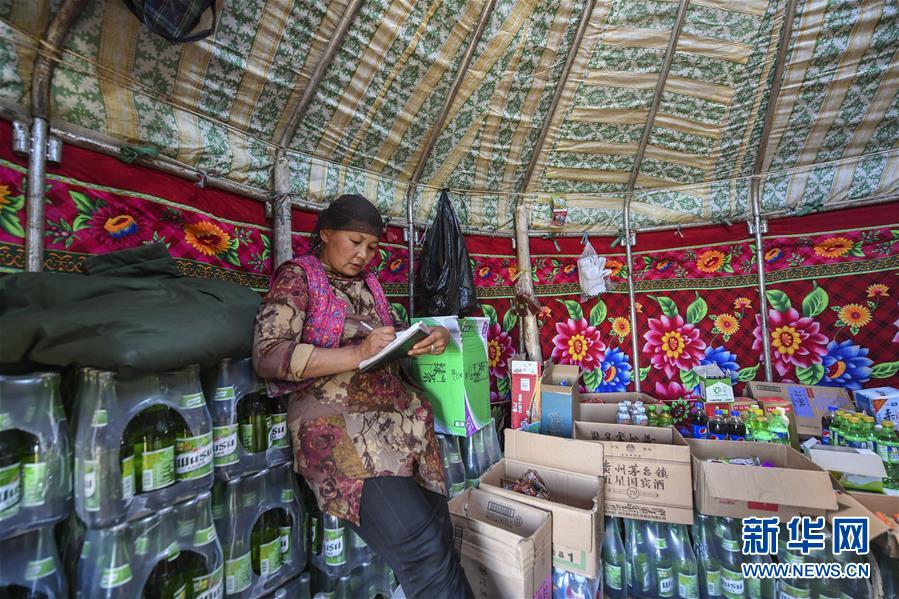 在新疆裕民县巴尔鲁克山中的一处夏牧场,36岁的库拉西·达吾拉提汗在自家经营的商店里登记账目。她告诉记者,近几天是转场的高峰期,营业额日均在400元左右(6月22日摄)。新华社记者胡虎虎摄