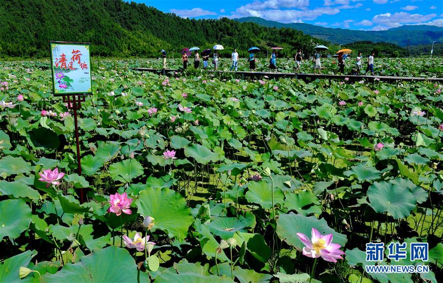7月19日,游客在武夷山市五夫镇“清风荷塘”主题公园游览。 近年来,福建省武夷山市五夫镇把发展特色种植和传统文化结合起来,通过大面积种植荷花,打造“清风荷塘”主题公园,促进了乡村旅游的发展。 新华社记者 张国俊摄