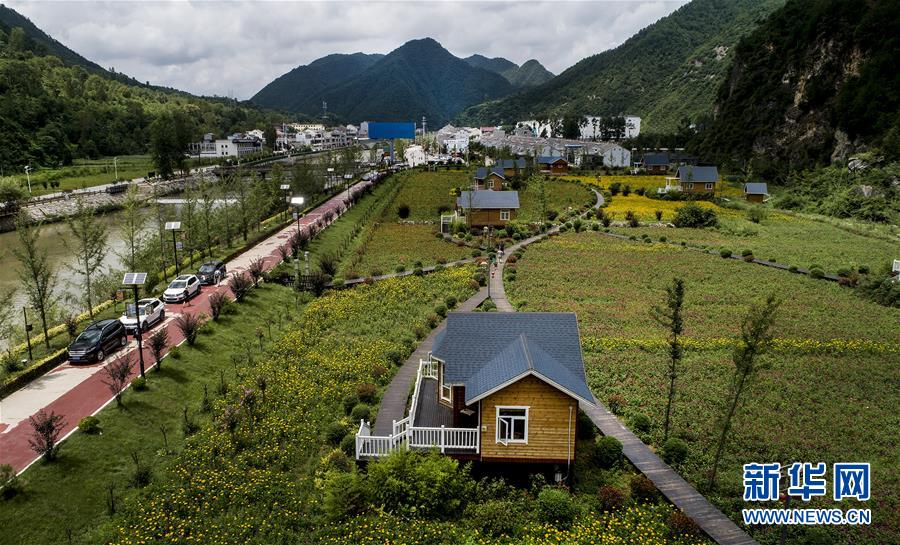 洛南县巡检镇巡检街社区花海小木屋休闲区(7月28日无人机拍摄)。