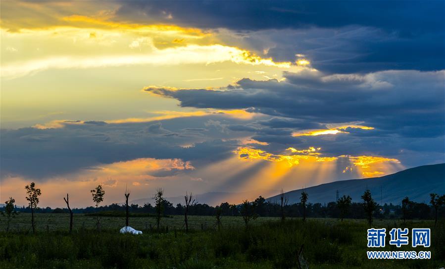 这是夕阳下的新疆伊犁哈萨克自治州那拉提草原(7月8日摄)。 新华社记者赵戈摄