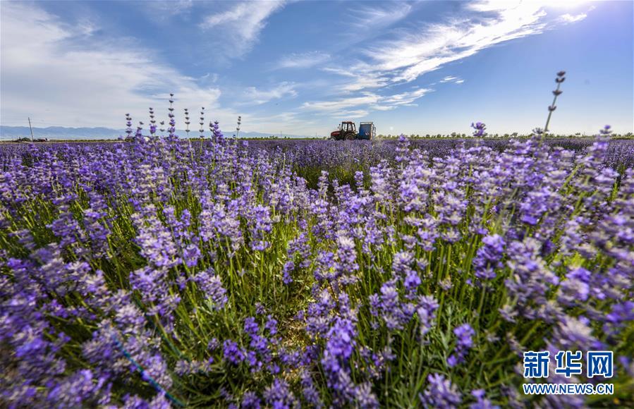 在新疆察布查尔锡伯自治县一处薰衣草花田里,农用机械在收割薰衣草(6月27日摄)。 新华社记者赵戈摄
