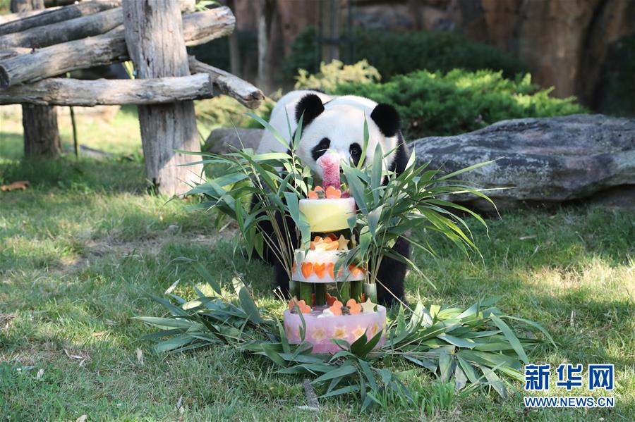 8月4日,在法国圣艾尼昂市博瓦勒野生动物园,大熊猫宝宝“圆梦”准备品尝“生日蛋糕”。 新华社发(博瓦勒动物园供图)