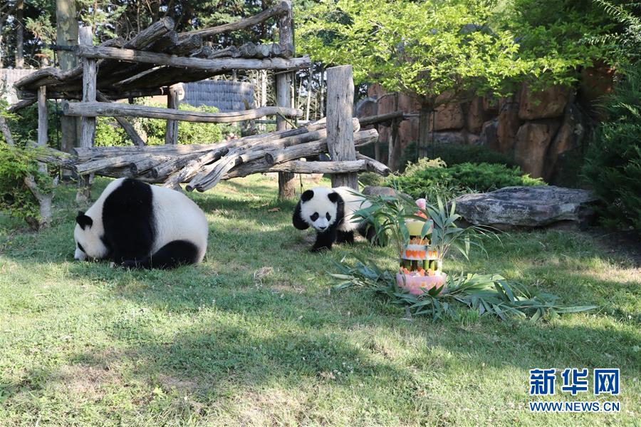 8月4日,在法国圣艾尼昂市博瓦勒野生动物园,大熊猫宝宝“圆梦”(右)准备品尝“生日蛋糕”。 新华社发(博瓦勒动物园供图)