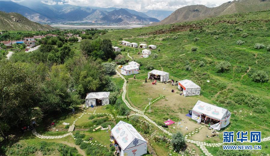 在拉萨市近郊达东村,“过林卡”的群众撑起的帐篷在山间排开(8月4日无人机拍摄)。