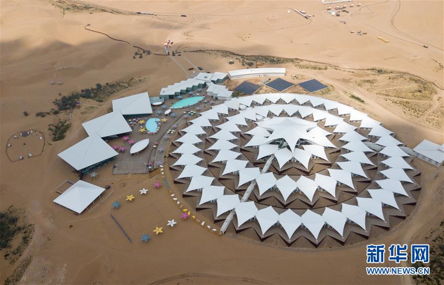 库布其沙漠中的响沙湾莲花度假酒店(7月31日无人机拍摄)。 新华社记者彭源摄