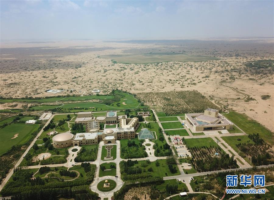位于内蒙古杭锦旗的七星湖沙漠酒店(8月1日无人机拍摄)。 新华社记者邢广利摄