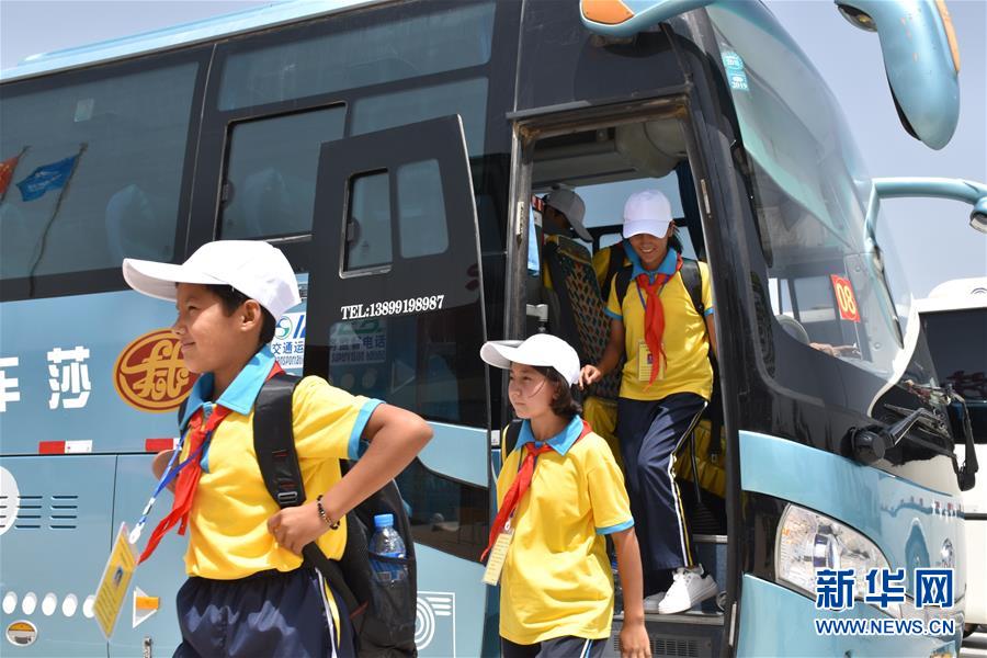 在喀什地区莎车县,走下大巴的当地青少年即将踏上“手拉手”上海之旅(8月5日摄)。