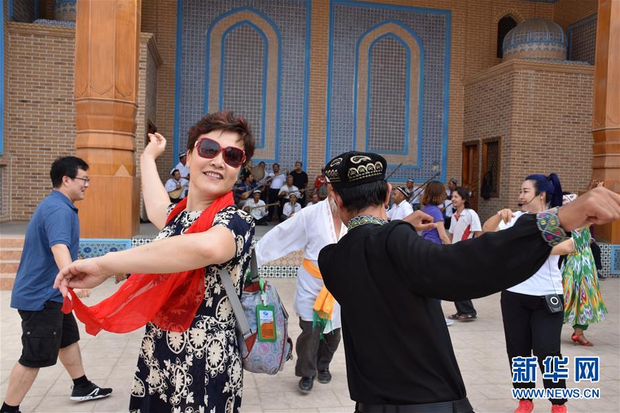 乘坐包机抵达莎车县的游客伴随着音乐翩翩起舞(8月5日摄)。