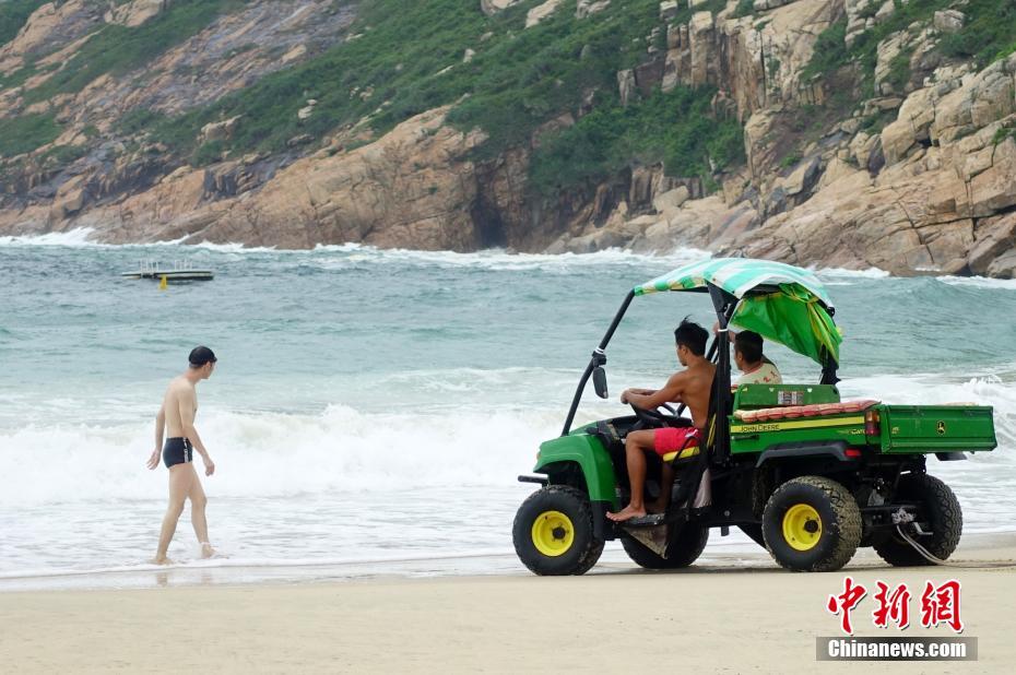 9月12日,位于香港岛东部的石澳泳滩,救生员正在劝阻游客不要下海游泳。 中新社记者 张炜 摄