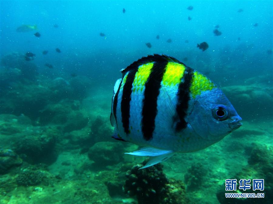 9月12日,在分界洲岛海域,一条五线雀鲷在海中游弋。 十多年来,海南省分界洲岛一直致力于珊瑚的保护和培育,并在海洋专家的指导下投放人工礁,为珊瑚生长提供条件,从而为鱼类提供适宜的生存环境。如今的分界洲岛海域珊瑚礁生态系统较为完好,吸引了大量游客前来旅游观光,体验身处鱼群中的潜水乐趣。 新华社记者郭程摄