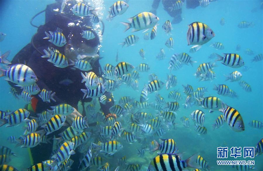 9月12日,在分界洲岛海域,一名游客在体验潜水。 十多年来,海南省分界洲岛一直致力于珊瑚的保护和培育,并在海洋专家的指导下投放人工礁,为珊瑚生长提供条件,从而为鱼类提供适宜的生存环境。如今的分界洲岛海域珊瑚礁生态系统较为完好,吸引了大量游客前来旅游观光,体验身处鱼群中的潜水乐趣。 新华社记者丁旭摄