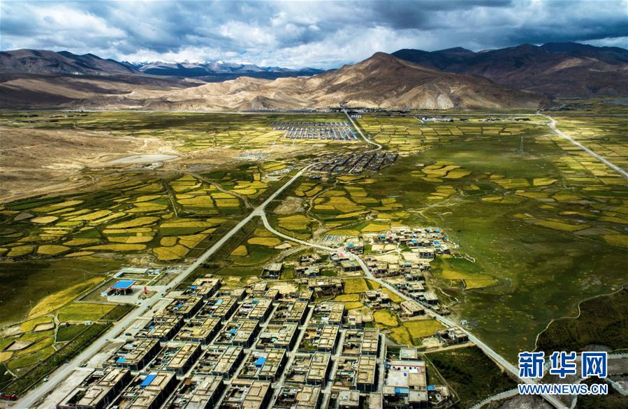 这是西藏日喀则市萨迦县农田风光(9月12日无人机拍摄)。 西藏日喀则各地秋季美景如画,令人陶醉。 新华社发(旦增尼玛曲珠 摄)