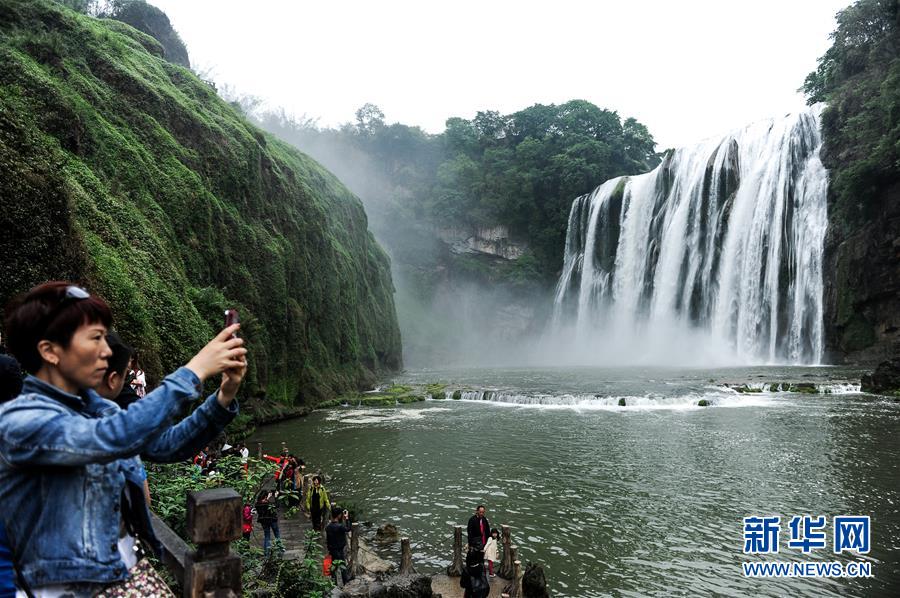 游客在贵州安顺市黄果树瀑布景区游玩(2016年4月29日摄)。 新华社记者 陶亮 摄