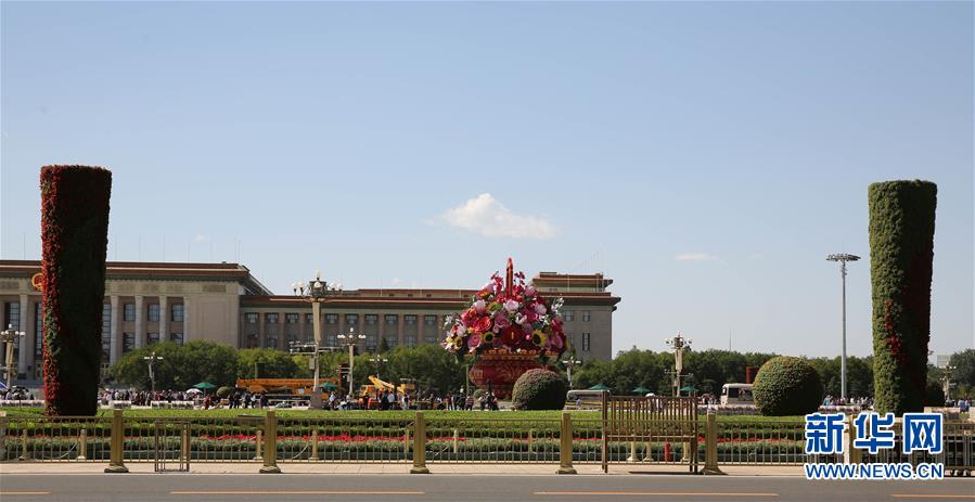 9月21日,工人在天安门广场布置“祝福祖国”巨型花篮。 新华社发(梁志强 摄)