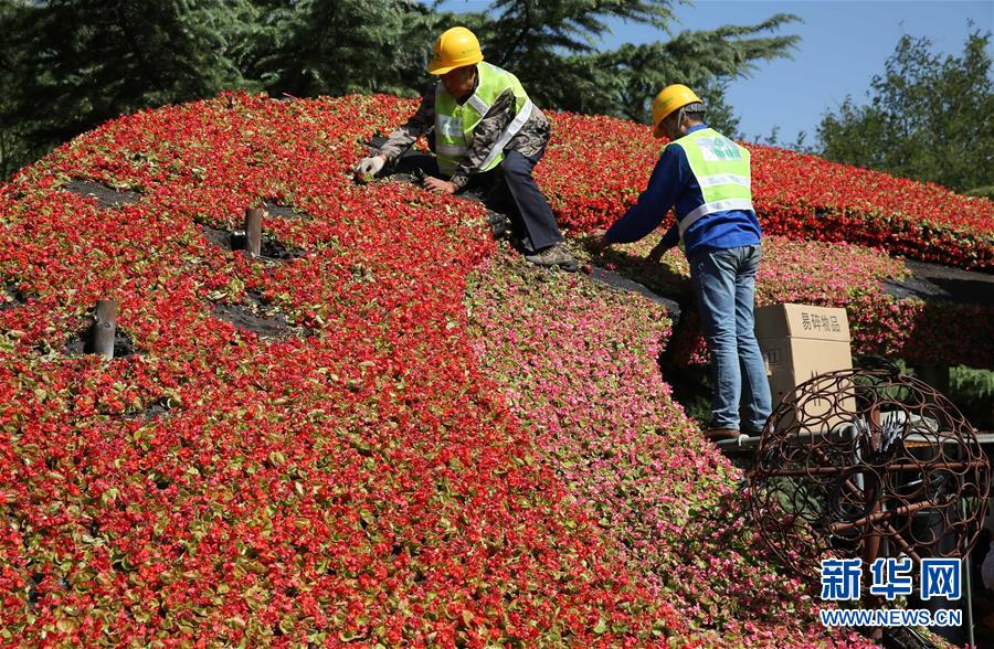 9月21日,工人在布置一处位于东单的花坛。 新华社发(梁志强 摄)