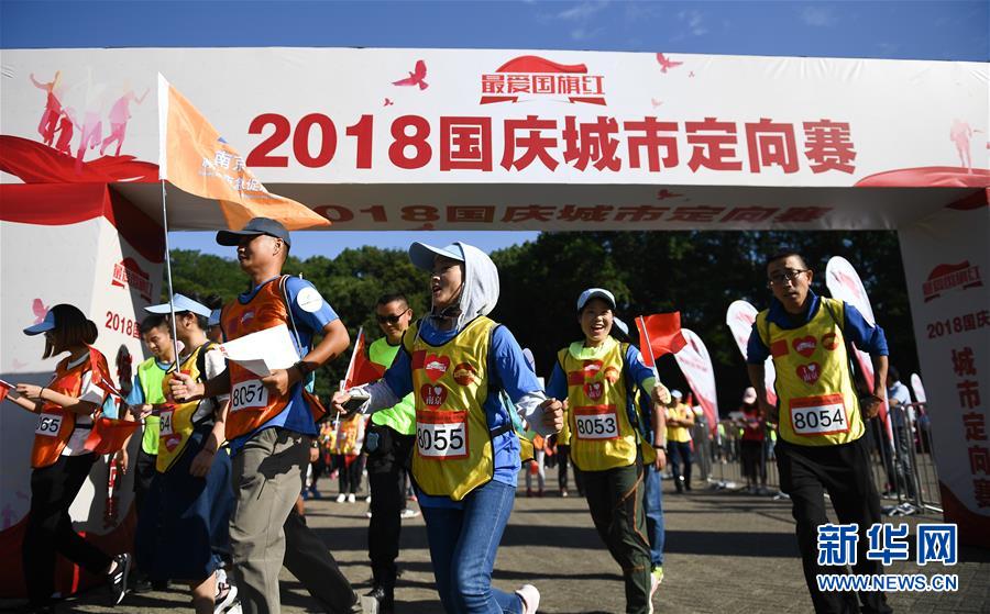 10月1日,在南京雨花台烈士陵园,参赛选手在“最爱国旗红·2018国庆城市定向赛”中出发。 当日是国庆节,全国各地的人们用各种方式欢度节日。 新华社记者 李响 摄