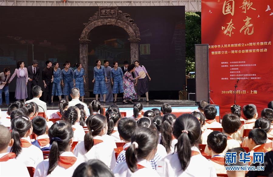 10月1日,在上海国歌纪念广场,上海歌剧院演员在“国歌嘹亮——庆祝中华人民共和国成立69周年升旗仪式暨国歌立法一周年公益展演宣传活动”现场表演音乐剧《国之当歌》。 当日是国庆节,全国各地的人们用各种方式欢度节日。 新华社记者 刘颖 摄