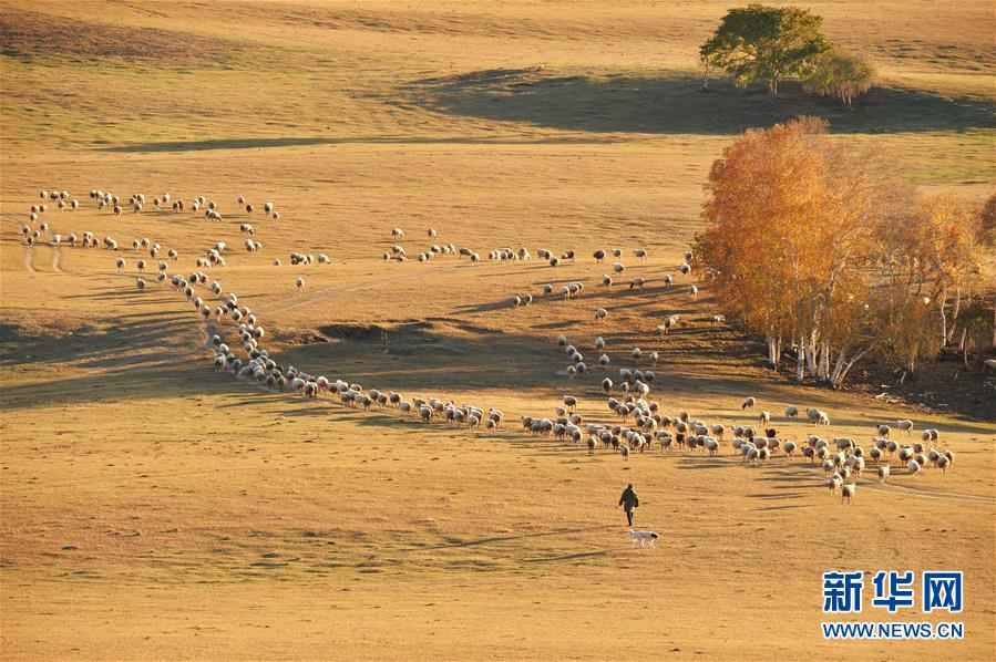 10月2日,羊群在内蒙古赤峰市克什克腾旗乌兰布统草原觅食。 金秋十月,内蒙古大地披金、层林尽染,秋景如画。 新华社发(王正 摄)