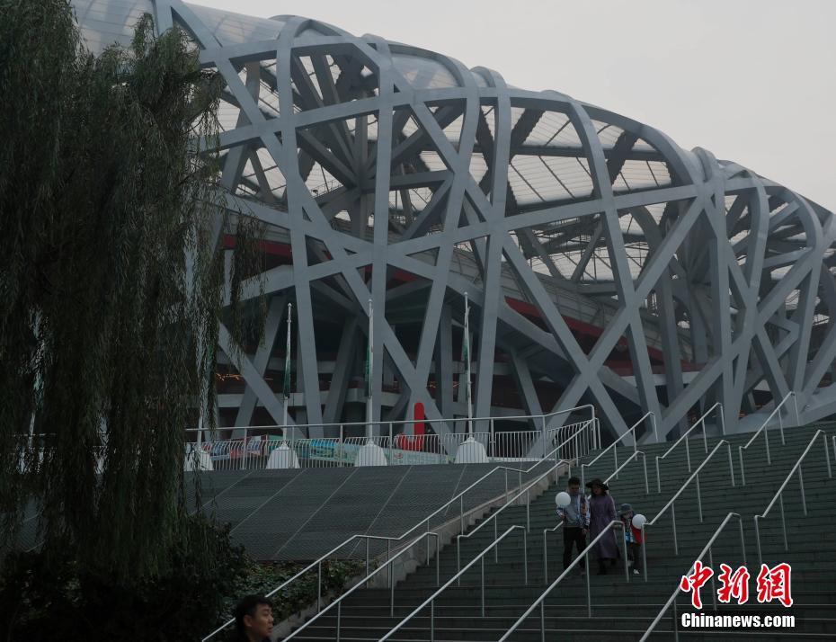 10月14日,游客在北京国家体育场附近游玩。北京市环境保护监测中心的实时监测数据显示,当日19时北京空气质量达重度污染,实时空气质量指数211,首要污染物为PM2.5。中新社记者 刘关关 摄