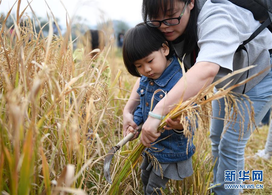 10月21日,游客在湖州市吴兴区一处农场的稻田里体验割稻子。