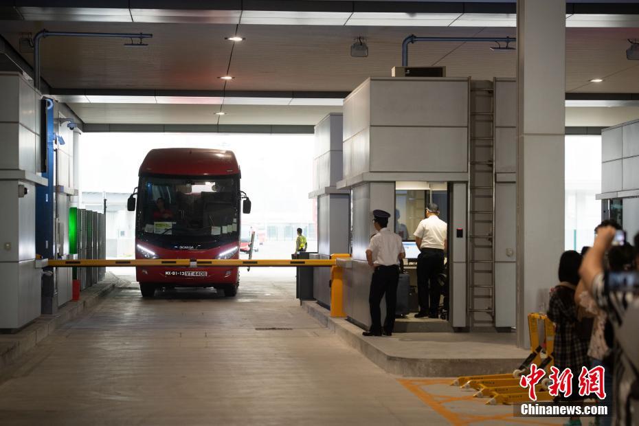 随着澳门口岸离境车道闸口开杆放行,首辆穿梭巴士驶过关口,港珠澳大桥正式通车运营。中新社发 钟欣 摄