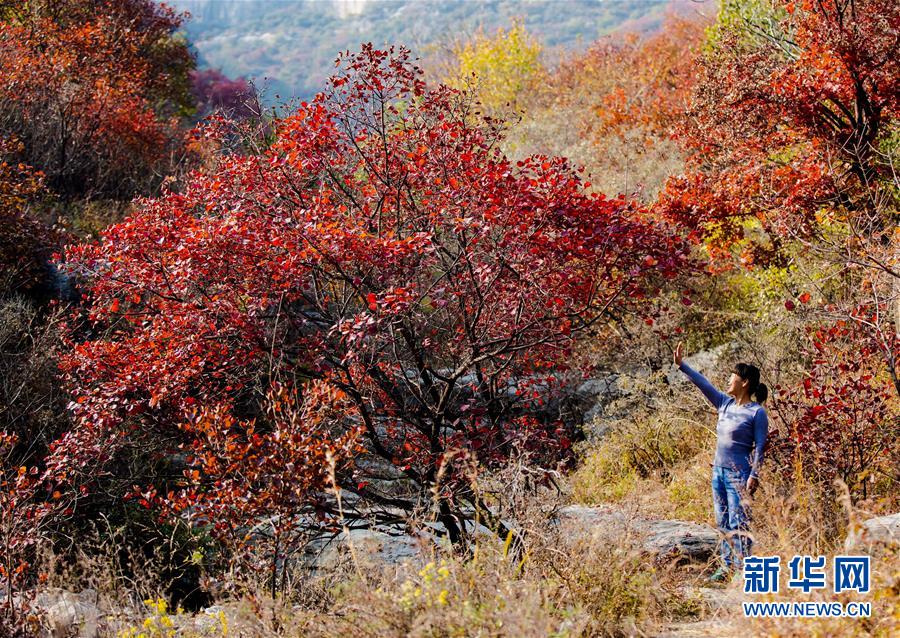 10月24日,游客在河北省武安市贺进镇后临河村观赏红叶。 金秋时节,位于太行山区的河北省武安市贺进镇后临河村的红叶进入观赏佳期。 新华社记者 王晓 摄