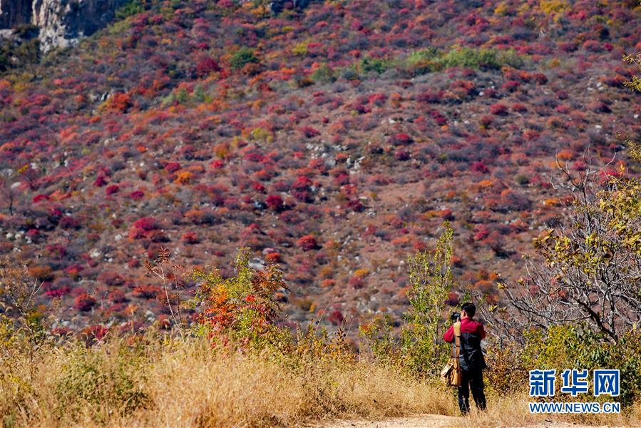 10月24日,游客在河北省武安市贺进镇后临河村拍摄红叶。 金秋时节,位于太行山区的河北省武安市贺进镇后临河村的红叶进入观赏佳期。 新华社记者 王晓 摄