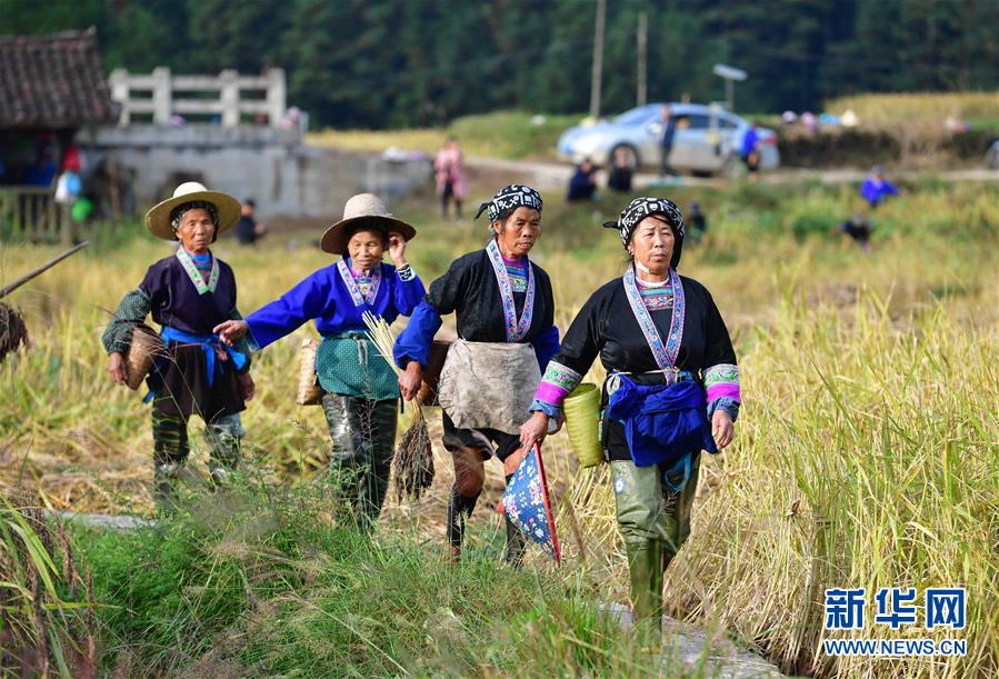 广西融水苗族自治县安太乡元宝村金秋香糯近日迎来丰收日,当地种植合作社组织社员集中收获香糯。