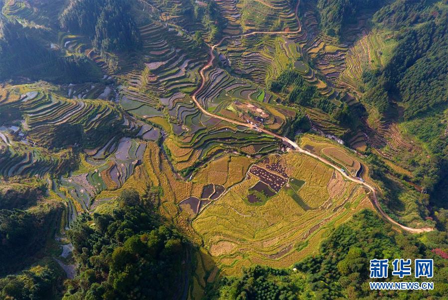这是广西融水苗族自治县安太乡元宝村香糯种植基地(10月30日无人机拍摄)。 新华社记者 吴建路 摄