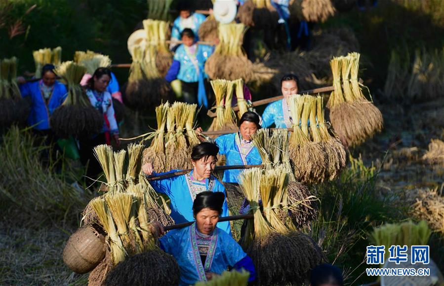 10月30日,在广西融水苗族自治县安太乡元宝村,村民挑着香糯走在田间。 新华社记者 黄孝邦 摄