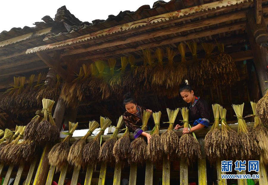 10月30日,在广西融水苗族自治县安太乡元宝村,村民在风雨桥上晾晒刚刚收获的香糯。新华社记者 吴建路 摄