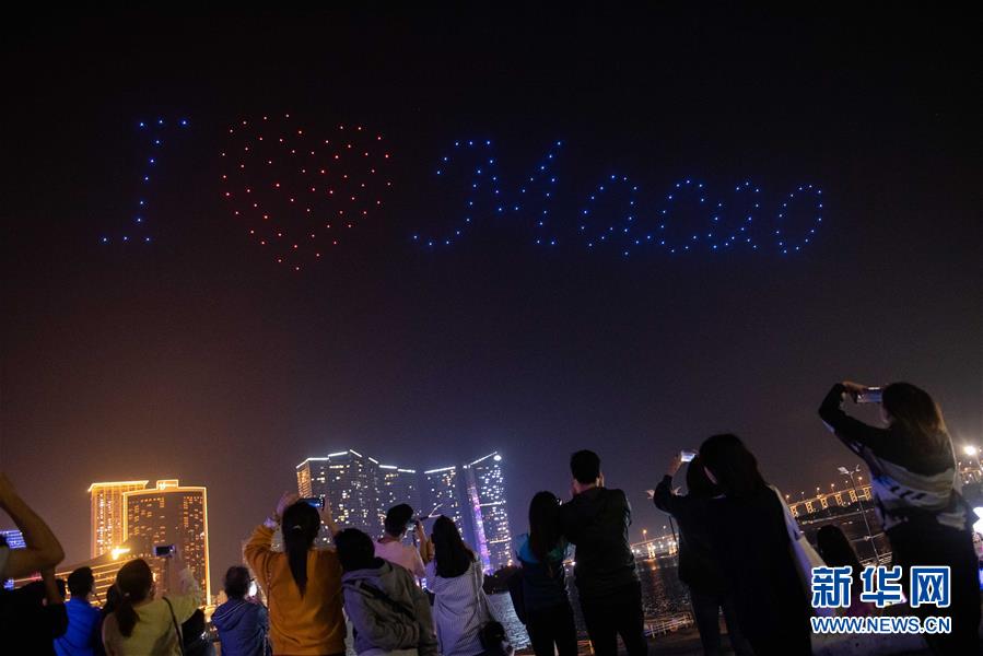 12月2日,无人机在澳门南湾湖水上活动中心进行空中图案表演。 新华社记者 张金加 摄