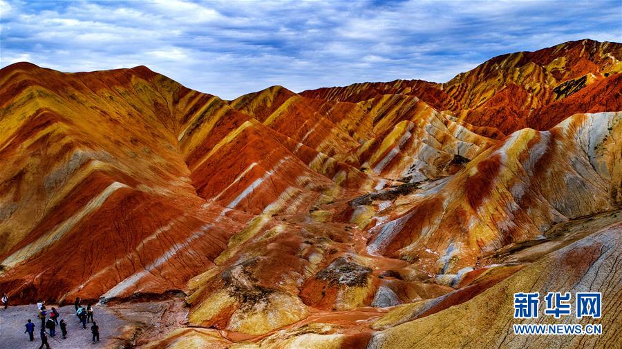 2018年9月5日,游人在张掖丹霞国家地质公园游览。 大地之色,俯仰之间;壮美山河,是我的祖国。2018年,新华社记者操纵无人机“飞阅”华夏大地,在最美的时节,定格下她的色彩斑斓。 新华社记者 陶明 摄