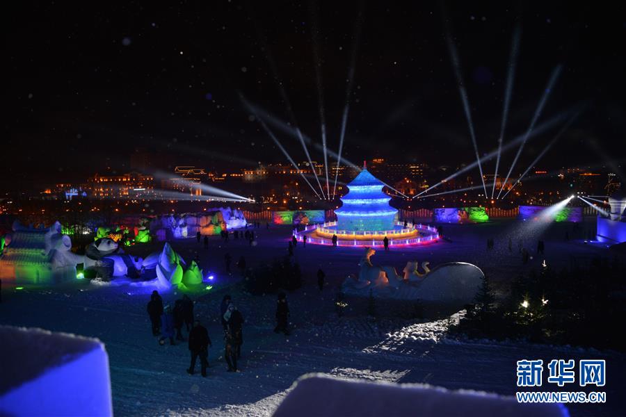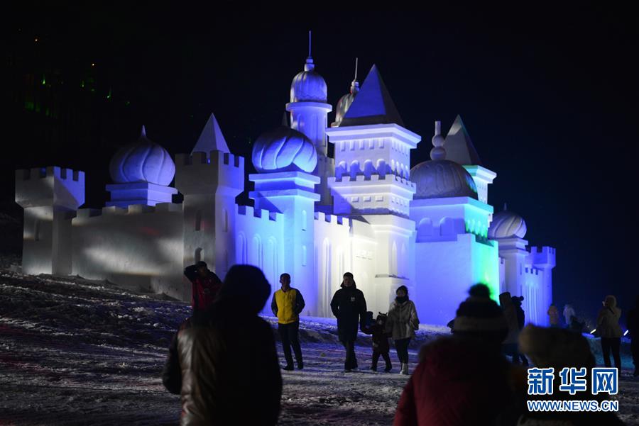 12月21日,游客在冰雪节开幕式上走过雪雕城堡。 新华社记者 邹予摄