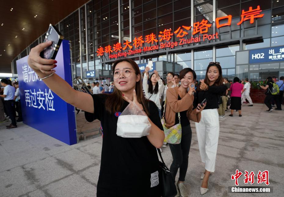2018年10月24日上午,港珠澳大桥正式通车,旅客在大桥珠海公路口岸门口兴奋自拍,见证历史。 中新社记者 张炜 摄