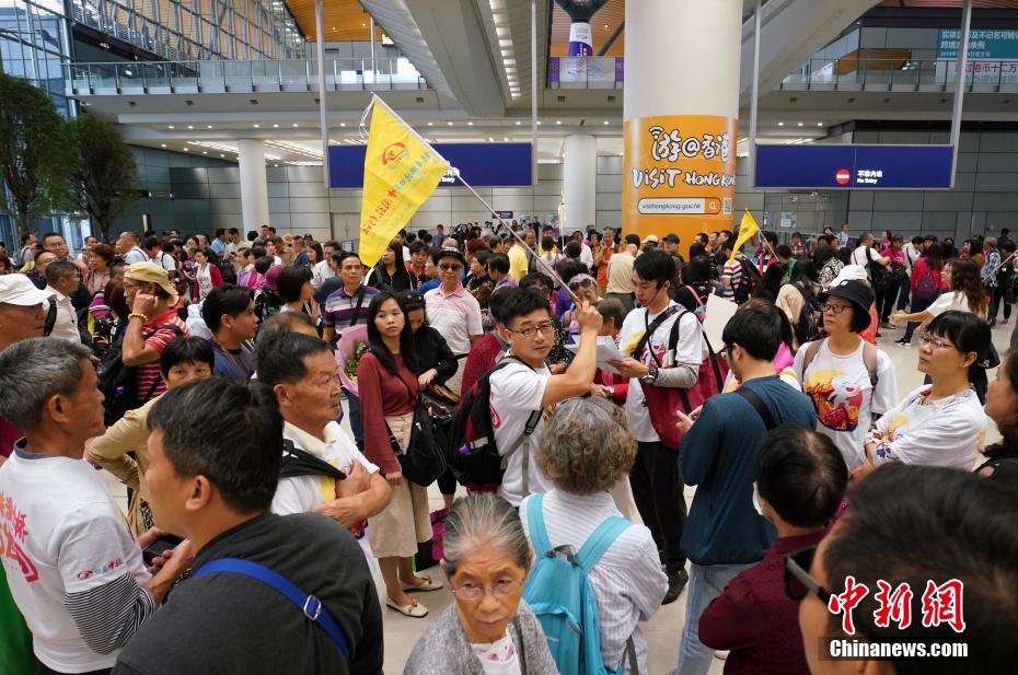 2018年10月24日,经港珠澳大桥抵达香港口岸的内地旅客在旅检大楼集合。大桥通车首日,客流量超过7万人次。 中新社记者 张炜 摄