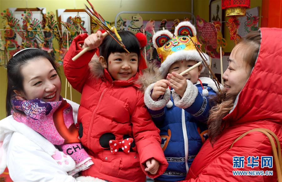 2月13日,在西安小雁塔荐福文化大庙会上,游客带着孩子了解传统皮影。