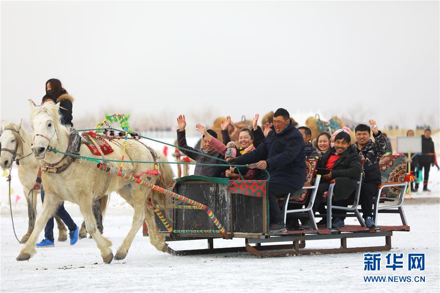 游客在南疆巴音郭楞蒙古自治州境内的博斯腾湖冰面上体验马拉爬犁(2月6日摄)。 各地张灯结彩,处处欢声笑语,地处中国西北边陲的新疆各族群众,新春佳节期间,耍社火、逛庙会、看演出、玩冰雪,载歌载舞,在浓浓的中华传统文化氛围中热热闹闹过大年。 新华社发(年磊 摄)