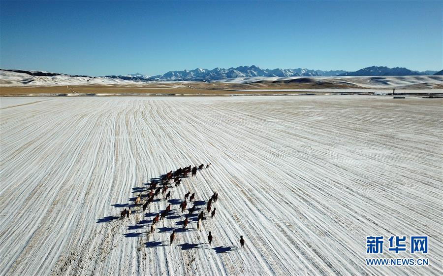 马群在山丹马场上奔跑(1月22日无人机拍摄)。 当瑞雪降临,祖国大好河山万里银装,一片素裹,宛如仙境。新华社记者带您从天空的视角领略雪国的风光。 新华社记者 陈斌 摄