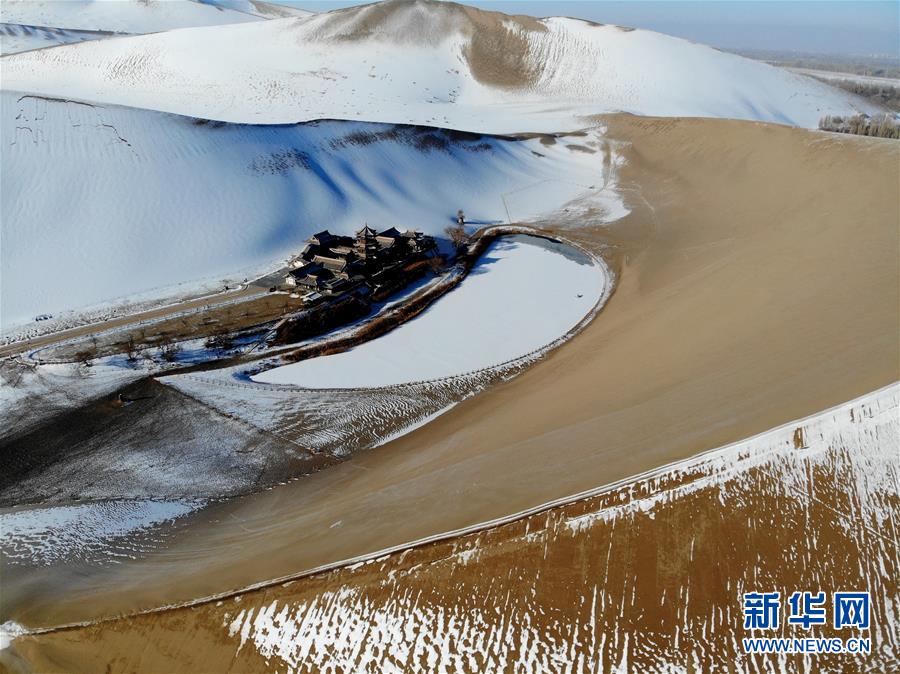 这是甘肃省敦煌市鸣沙山月牙泉景区雪景(1月21日无人机拍摄)。 当瑞雪降临,祖国大好河山万里银装,一片素裹,宛如仙境。新华社记者带您从天空的视角领略雪国的风光。 新华社发(张晓亮 摄)