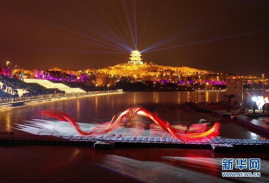 2月15日,民间艺人在唐山市南湖公园为游客舞龙灯(无人机拍摄)。 新华社记者杨世尧摄
