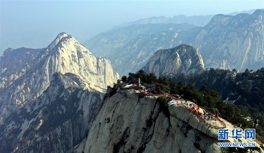 3月9日,游人在华山西峰游览(无人机拍摄)。 随着气温回升,陕西著名风景区华山进入旅游旺季。 新华社记者 陶明 摄