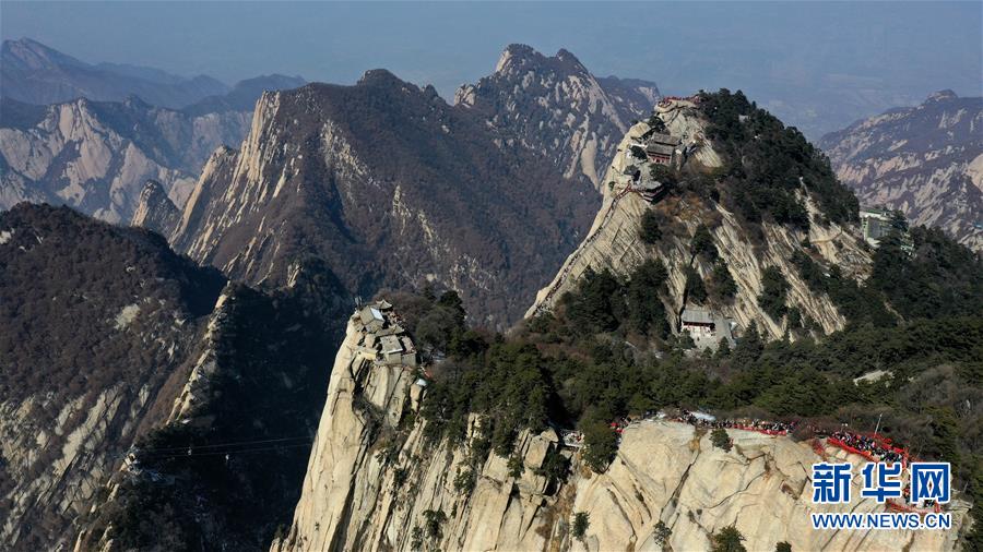 3月9日,游人在华山南峰游览(无人机拍摄)。 随着气温回升,陕西著名风景区华山进入旅游旺季。 新华社记者 陶明 摄