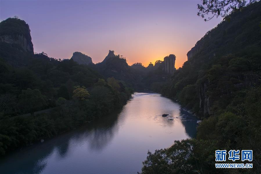 在福建武夷山风景名胜区,玉女峰与九曲溪沐浴在落日余晖之中(3月12日摄)。 近日,福建武夷山烟雨初歇、天气放晴、气温回升,青山绿水间时有云雾缭绕,宛若仙境。近年来,福建省武夷山市坚持生态优先,推进绿色发展,让“高颜值”山水释放出越来越多“生态红利”。 新华社记者 宋为伟 摄