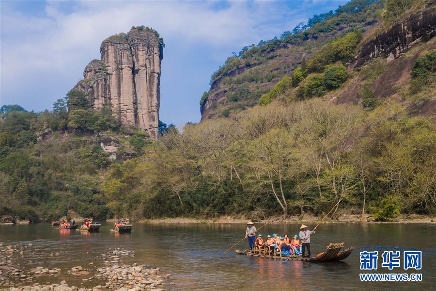 3月13日,游客在福建省武夷山风景名胜区乘坐竹筏游览九曲溪。 近日,福建武夷山烟雨初歇、天气放晴、气温回升,青山绿水间时有云雾缭绕,宛若仙境。近年来,福建省武夷山市坚持生态优先,推进绿色发展,让“高颜值”山水释放出越来越多“生态红利”。 新华社发(陈颖 摄)
