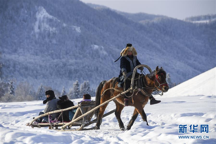 在新疆阿勒泰地区布尔津县禾木村,经营马拉爬犁的牧民载着游客观赏雪景(1月11日摄)。 新华社记者 胡虎虎 摄