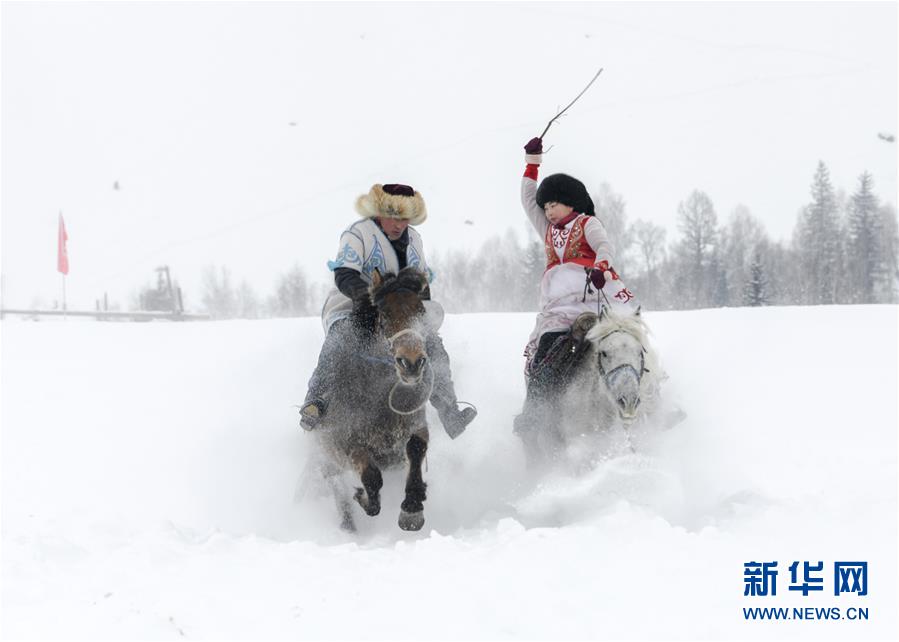 在新疆禾木雪乡,当地居民表演“雪地姑娘追”(1月1日摄)。 新华社记者 赵戈 摄